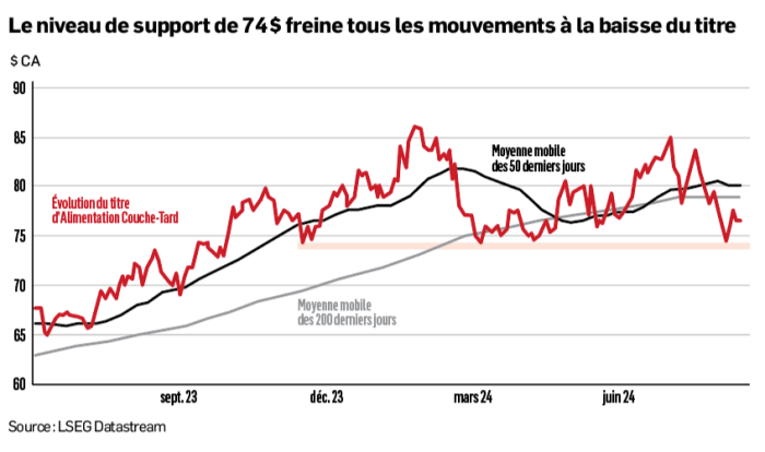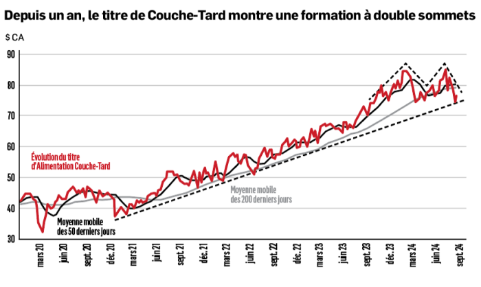 Après avoir atteint un sommet historique de 87 $ en février (premier sommet), le cours de l’action a traversé une période de correction lorsque les résultats trimestriels annoncés en mars et en juin ont montré un ralentissement dans le secteur du commerce de proximité. À la fin du mois de juin, le titre a amorcé une reprise qui semblait prometteuse, mais qui s’arrêta à 85 $ (second sommet).