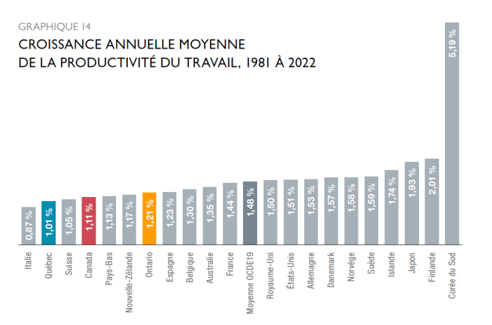 En 1981, au Québec, notre productivité était 50,24$. En 2022, elle avait seulement progressé de 51% en quatre décennies pour s’établir à 75,88$.