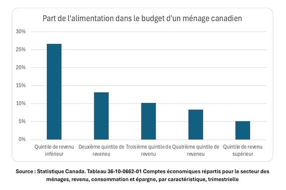 On voit donc que pour le quintile le plus bas (personnes gagnant en moyenne moins de 29 376 $ une fois ramené sur une base annuelle), près de 27 % du budget est consacré à l’alimentation.